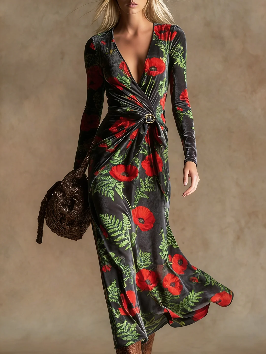 This velvet maxi dress combines vintage-inspired prints with a V-neck design, seamlessly blending retro charm with modern elegance. Crafted from luxurious velvet fabric, this gown is sure to be a style statement at any event. The deep V-neck adds a touch of allure, while the delicate gold prints shimmer subtly against the rich green background, creating a striking visual contrast.