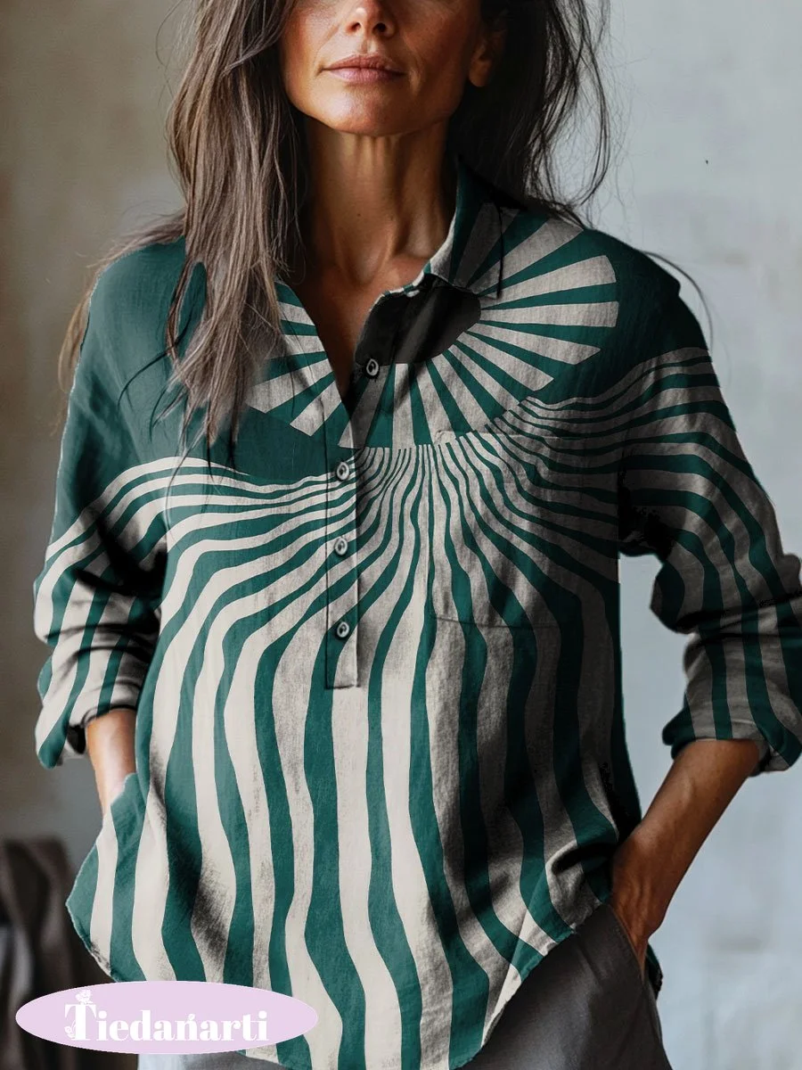 Women's Abstract Stripes Art Print Casual Cotton And Linen Shirt