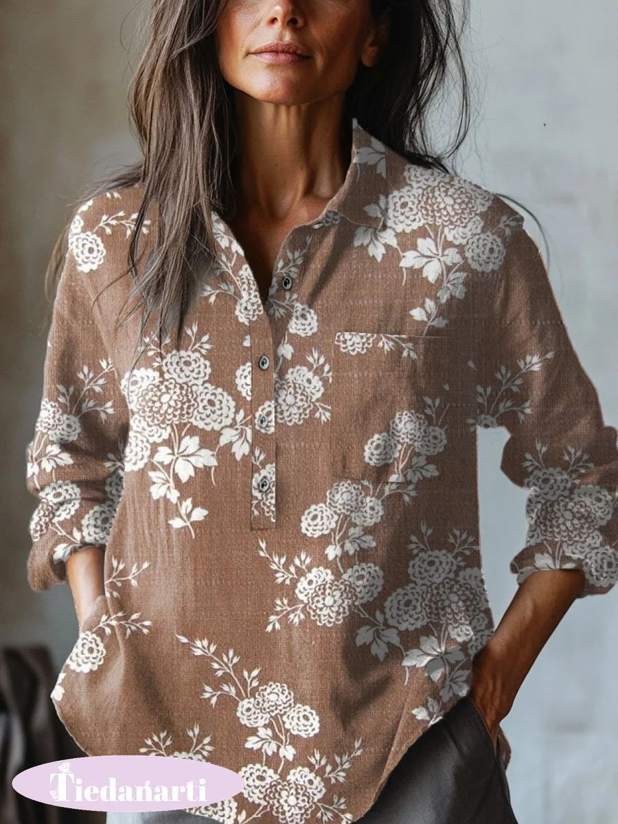 Women's Floral Art Print Casual Cotton And Linen Shirt