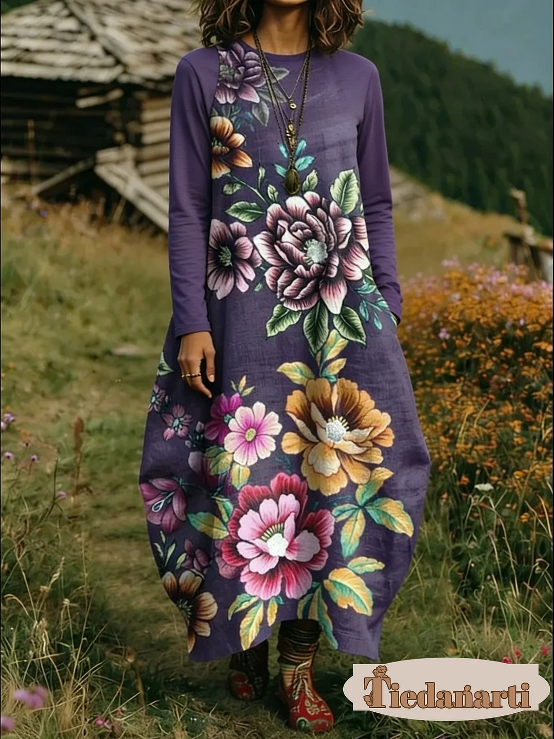 Women's Floral Print Crew Neck Long Sleeve Cotton Pocket Dress
