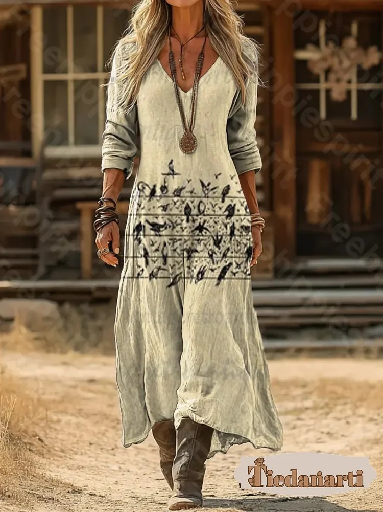 Women's Retro Bird Note V-Neck Long Sleeve Cotton Pocket Dress