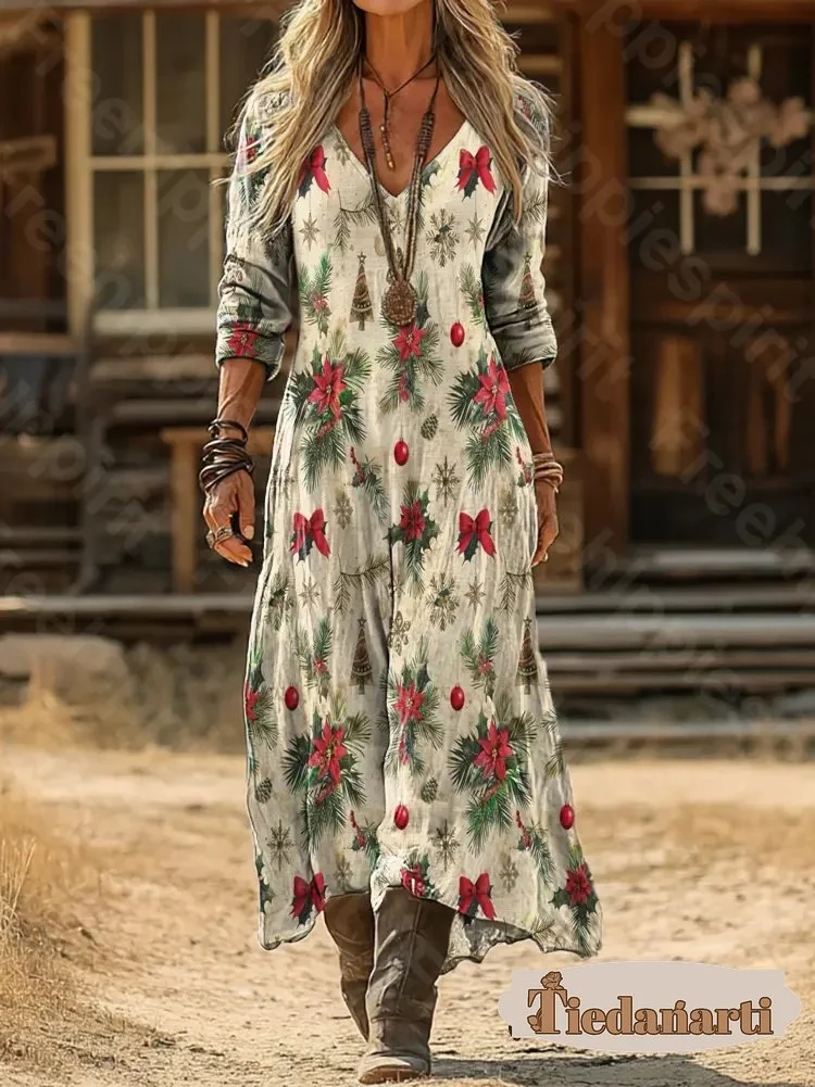 Women's Vintage Christmas Floral Print V-Neck Long Sleeve Cotton Pocket Dress