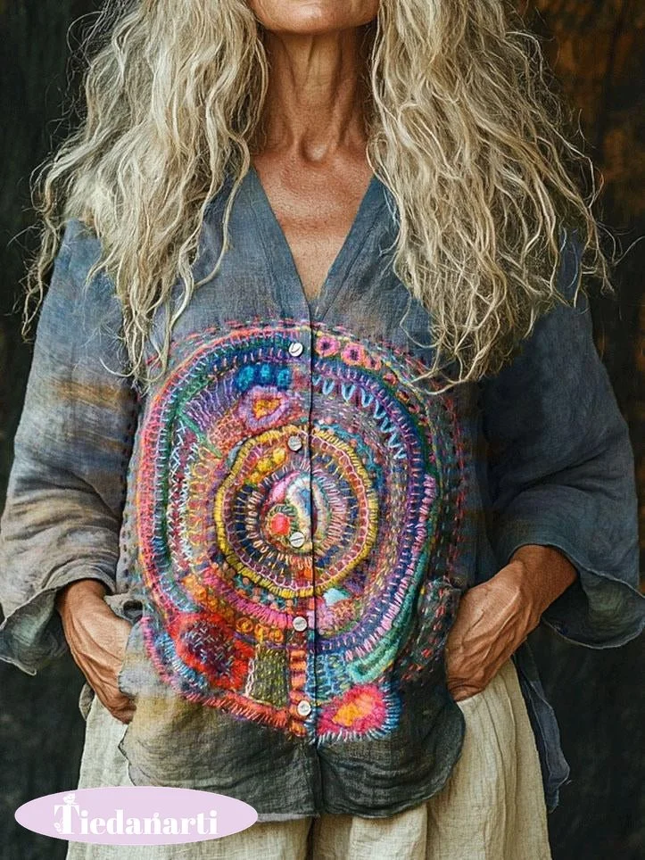 Women's Vintage Embroidery Floral Totem Print Linen And Cotton V-neck Casual Shirt