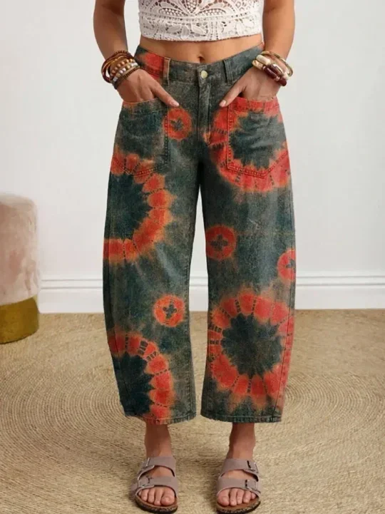 Women's Vintage-style Textured Floral Art Print Casual Cotton Trousers With Pockets.